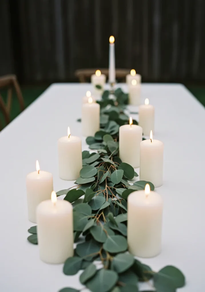 This centerpiece is all about timeless simplicity. A long garland of eucalyptus leaves stretches down the table, dotted with clusters of creamy white pillar candles. The soft flicker of candlelight against the muted green leaves makes the whole table feel calm, warm, and inviting.