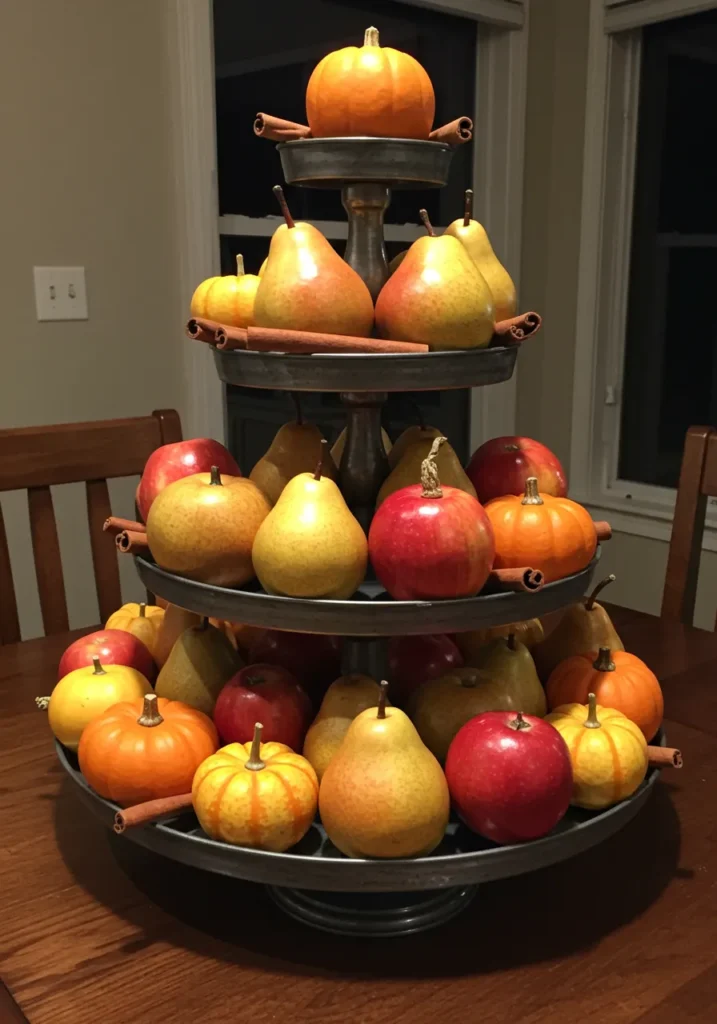 A three-tiered stand is packed with pears, apples, and small pumpkins, with cinnamon sticks tucked in for extra texture. The layers feel abundant and give the centerpiece a bold, full look that screams harvest season.