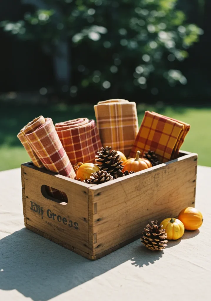 A rustic wooden crate is filled with rolled plaid napkins, pinecones, and mini pumpkins. The mix of textures creates a cozy farmhouse feeling while keeping things casual and practical.