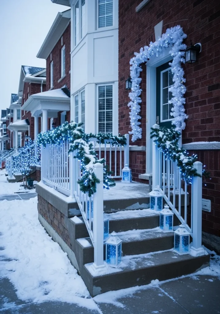 This charming brick home looks like it’s straight out of a winter storybook. The porch railing is wrapped in snowy garlands of evergreen branches sprinkled with twinkling blue and white lights, creating a soft frosted sparkle against the red brick. White lanterns with a cool icy glow line each step, guiding the way to a door framed by fluffy white garland that almost looks like it’s made of snow itself. The whole scene feels crisp, festive, and perfectly balanced between cozy and elegant.