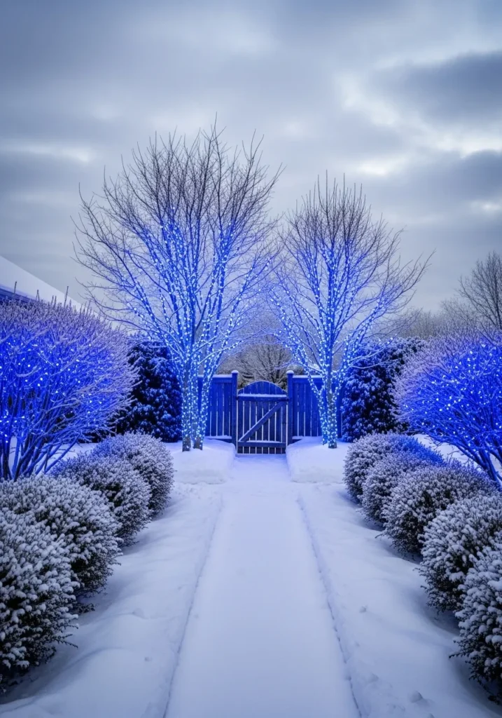 This snowy garden path looks like something straight out of a winter fairytale. The tall, bare trees are wrapped in icy blue lights that shimmer against the snow-covered walkway, guiding your eyes toward a charming wooden gate at the end. The surrounding bushes are softly dusted in snow, reflecting that magical blue hue that feels both crisp and calming. It’s simple, symmetrical, and absolutely breathtaking under a cloudy winter sky.