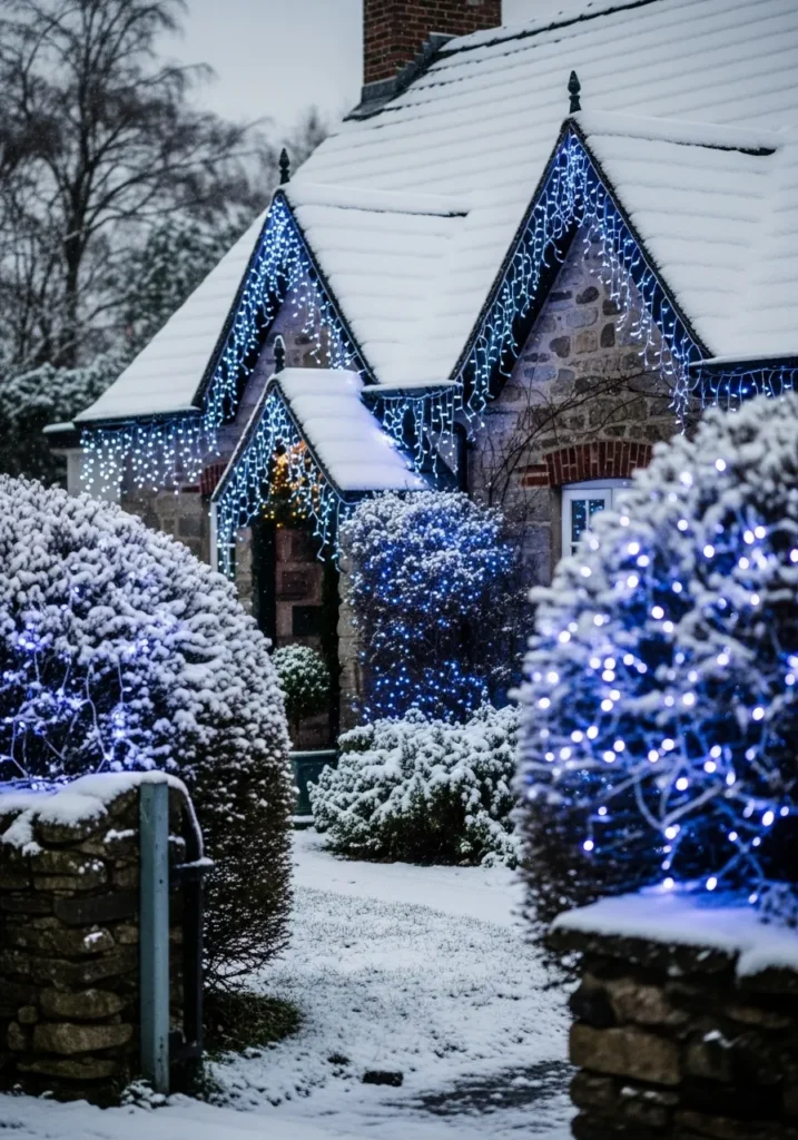 I absolutely love how this design feels both timeless and magical. There’s something so heartwarming about a simple stone cottage dressed up in sparkling blue and white lights. It feels like the kind of place you’d stumble upon during a quiet winter walk and instantly want to move into. The mix of cool and warm tones makes it look festive without being over the top, which is exactly my kind of Christmas style.