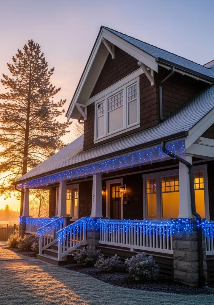 This charming Craftsman-style home feels like it’s straight out of a cozy winter postcard. Its deep brown siding contrasts beautifully with the crisp white trim, while the porch railing and roofline are draped in strands of icy blue lights that twinkle softly as dusk settles. The icicle lights create that perfect frosty sparkle, catching the last blush of sunset and making the entire porch glow with an inviting, magical hue. The soft yellow light from the windows adds warmth, balancing the chill of the blue glow and giving the whole house that storybook charm.