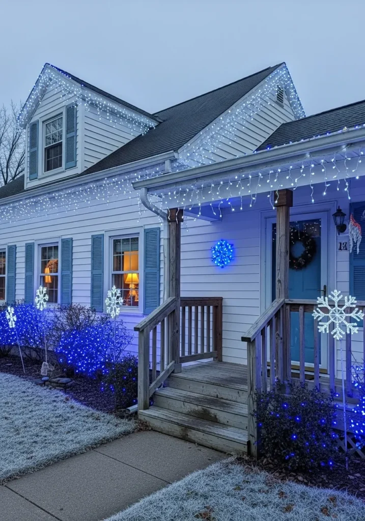 This charming white cottage glows beautifully with strands of icy-blue and white lights draped along the roofline like frozen raindrops. The little porch feels extra welcoming with its frosted steps and snowflake accents that sparkle softly in the evening light. Blue bushes twinkle below the windows, giving the whole scene a magical, winter-wonderland look that feels both festive and peaceful.