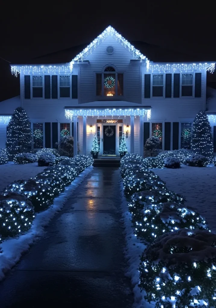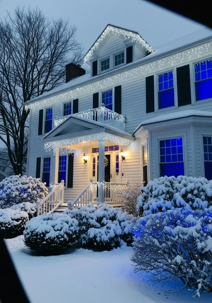 This beautiful Colonial-style home looks straight out of a snow globe, dressed in crisp white siding and trimmed with sparkling icicle lights that trace every edge of its classic gables. The blue glow from the windows adds such a dreamy contrast against the snow-covered yard, creating that perfect icy wonderland vibe. Even the shrubs get their moment with a dusting of snow and hints of blue lights twinkling through. It’s elegant, timeless, and has that polished “winter postcard” feel that never goes out of style.