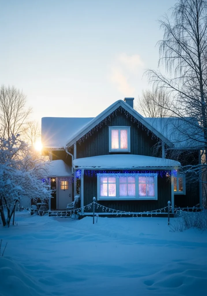 This cozy two-story home looks like something straight out of a Scandinavian Christmas card. The dark wooden siding contrasts beautifully with the soft white snow piled high on the roof and porch. Delicate icicle lights twinkle along the eaves, while strands of blue and white bulbs frame the frosted windows, making the whole house glow like it’s wrapped in a gentle winter spell. The snow-covered yard adds that untouched, storybook charm that makes you want to curl up inside with hot cocoa and fuzzy socks.