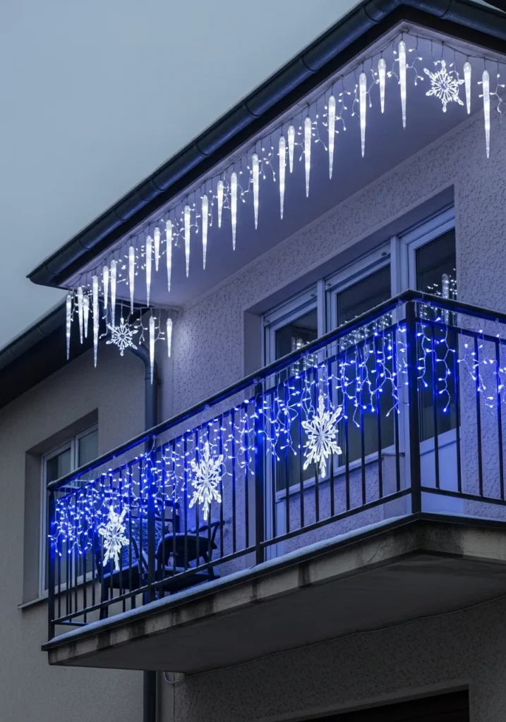 I absolutely love how this design transforms a simple balcony into a snowy dreamscape. There’s something so soothing about the balance of white icicles and deep blue lights—it feels elegant yet cozy. I’d totally wrap myself in a blanket, sip hot cocoa, and watch the lights sparkle against the night sky. It’s that perfect mix of festive and classy that makes me smile every time I see it.