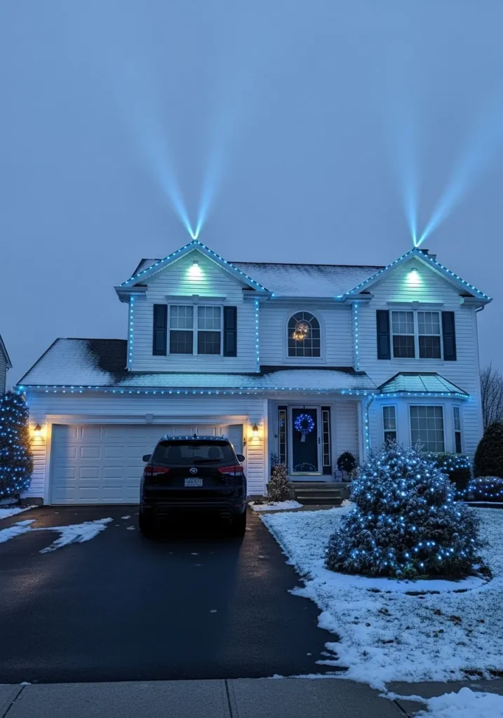 This house looks like it belongs straight out of a serene winter postcard. The clean white exterior is trimmed with icy blue lights that trace every edge and window with crisp precision. Soft beams of blue light reach upward from the roof, creating a subtle, magical glow against the snowy evening sky. A matching blue wreath and softly lit bushes complete the frosty color palette, giving the whole front yard a calm, cool shimmer that feels both modern and cozy at the same time.