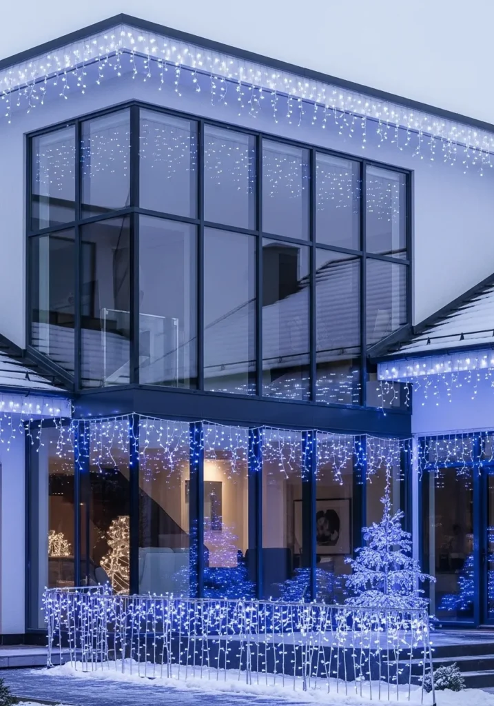 This sleek modern home feels like a crystal palace in winter, wrapped in shimmering blue and white icicle lights that dance across its glass walls. The large windows reflect every twinkle, making the whole house look like it’s been dusted with frost. The soft glow from inside adds warmth against the crisp exterior, and the snowy ground completes that magical winter postcard effect. It’s the kind of lighting that feels both luxurious and calming, perfectly balancing modern architecture with festive sparkle.