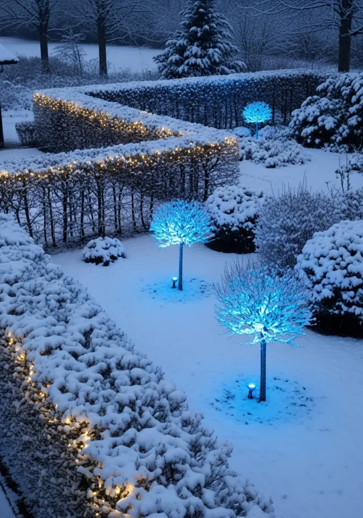 This stunning winter garden looks like it’s been sprinkled straight out of a fairytale. Neatly trimmed hedges are blanketed in snow, with soft white lights outlining their shape in the prettiest way. The real magic, though, comes from the small trees glowing in icy blue—casting a frosty, dreamlike hue across the snow-covered ground. Everything feels calm, elegant, and just a little bit enchanted, like a peaceful winter wonderland waiting quietly outside your window.
