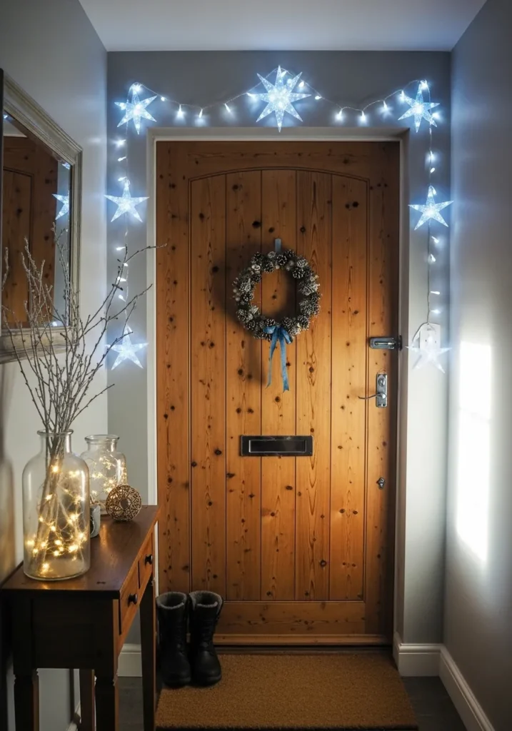This charming entryway feels like stepping into a gentle winter evening. The warm wood door creates a natural contrast against the icy white star lights draped overhead, casting a soft glow that feels both festive and calming. A pinecone wreath with a blue ribbon adds a lovely handmade touch, while the vase of fairy lights on the side table gives off that magical sparkle we all crave during December nights. Every detail here feels intentional, from the rustic textures to the way the cool light reflects softly on the pale walls.