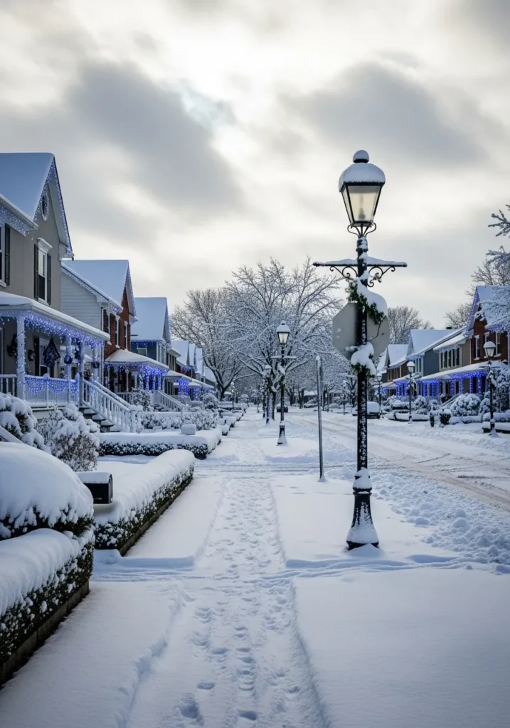 This photo captures the sweetest little neighborhood street blanketed in soft snow, where every porch seems to sparkle under a string of blue and white lights. The houses line up neatly with matching garlands and wreaths, giving off that perfect small-town charm you only see in Christmas movies. The street lamps look storybook-pretty with a dusting of snow, and the footprints in the walkway make it feel like the whole place is quietly alive with cozy winter magic.