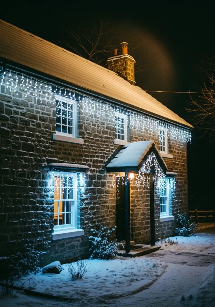 This charming stone cottage looks straight out of a snow globe with its classic brick façade wrapped in delicate icicle lights. The mix of soft white and icy blue tones gives the house an enchanting frozen effect, especially against the snowy backdrop. Each window glimmers gently, and the light dusting of snow on the roof adds the perfect wintery touch. The warm glow from the porch light creates just enough contrast to make the scene feel inviting instead of chilly.