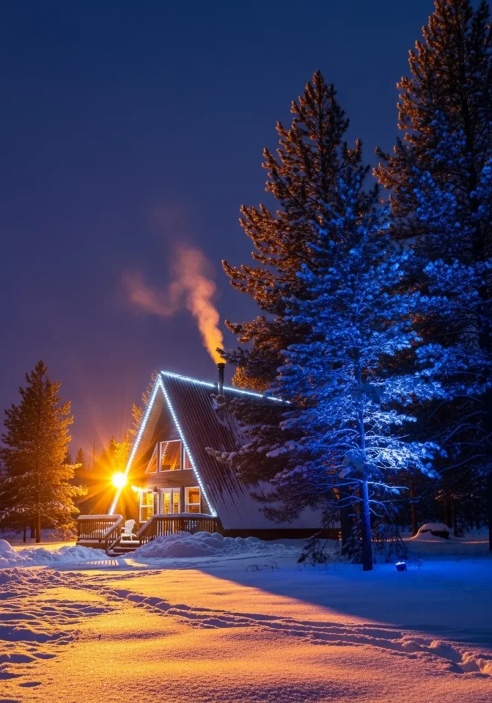 This charming A-frame cabin looks like it was plucked straight from a winter postcard. The steep roofline is traced with icy blue lights that shimmer against the snowy backdrop, while warm golden light spills from the windows and the porch lantern, creating the perfect contrast of cozy and cool. The tall pine trees surrounding the cabin catch the blue illumination beautifully, making the whole scene feel like a magical hideaway tucked deep in a snowy forest.