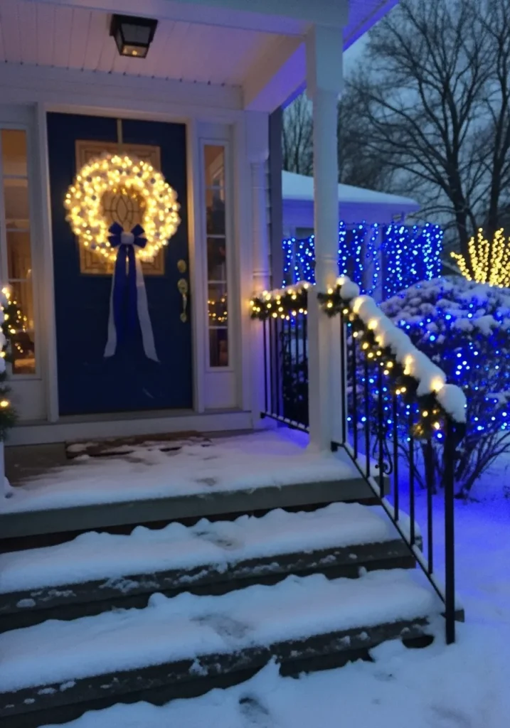 This cozy front porch looks like something straight out of a Christmas card. The deep blue front door sets the perfect backdrop for a glowing wreath of warm white lights, tied with a long satin ribbon that adds a touch of elegance. The handrails sparkle with twinkling garlands, softly dusted in snow, while the blue and white lights on the nearby bushes create a dreamy, frosty glow. The mix of golden and icy tones makes the whole entryway feel magical and welcoming, especially as dusk falls and the lights shimmer against the snow.