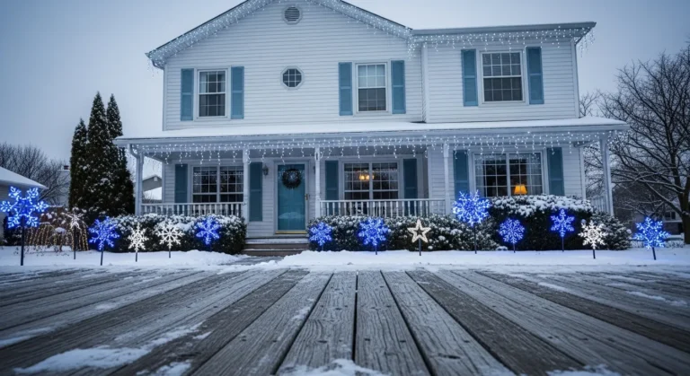 I absolutely love how this design captures that perfect “frosty but cozy” balance. The contrast between the crisp blue lights and the warm golden glow feels so peaceful, like a winter evening wrapped in a soft blanket. It’s the kind of porch that would make me slow down just to admire it, maybe with a mug of cocoa in hand, feeling instantly ready for the holidays.