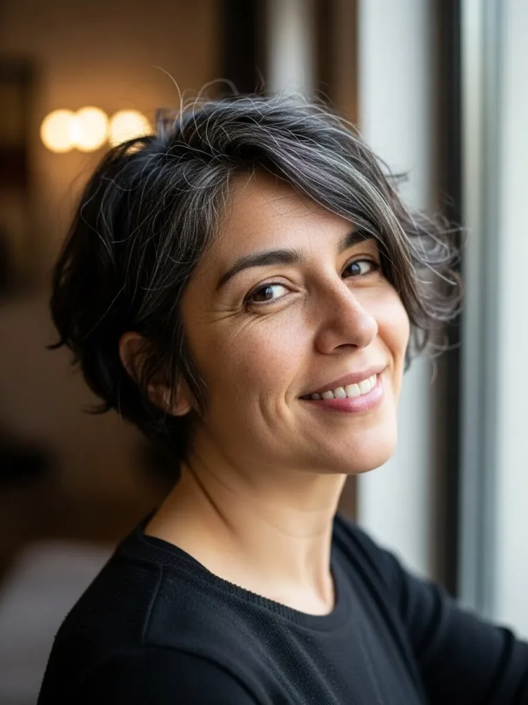 I adore the confidence of a salt and pepper bob. The choppy texture keeps it fun while the color makes the whole style feel natural and expressive. It is one of those cuts that feels like a perfect blend of ease and attitude.