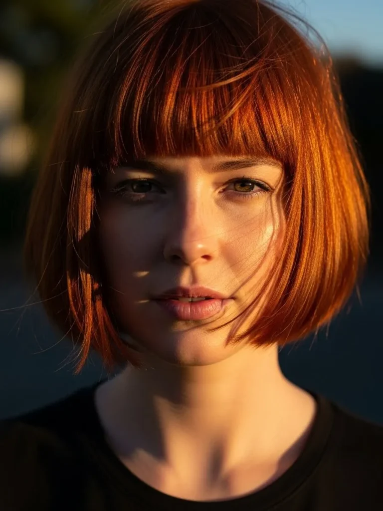 This vibrant copper bob has a sharp blunt shape that gives the whole style a bold presence. The baby bangs sit softly across the forehead while the ends of the bob keep a smooth edge. The rich copper shade shines beautifully in the light and makes the cut look even more striking.