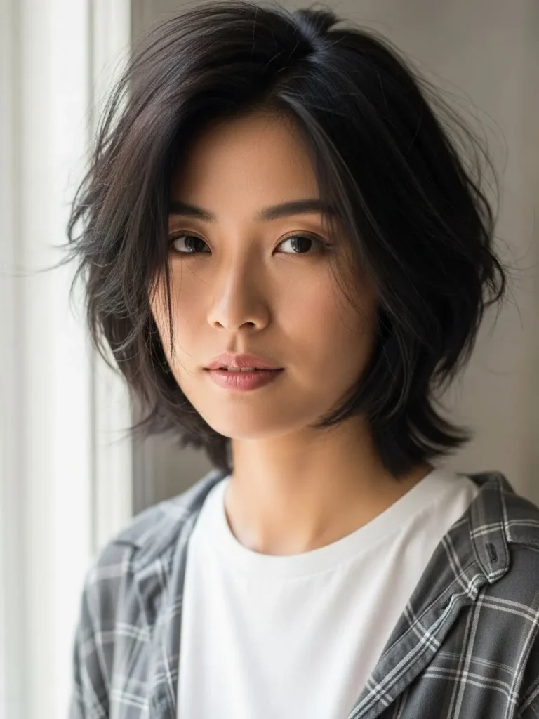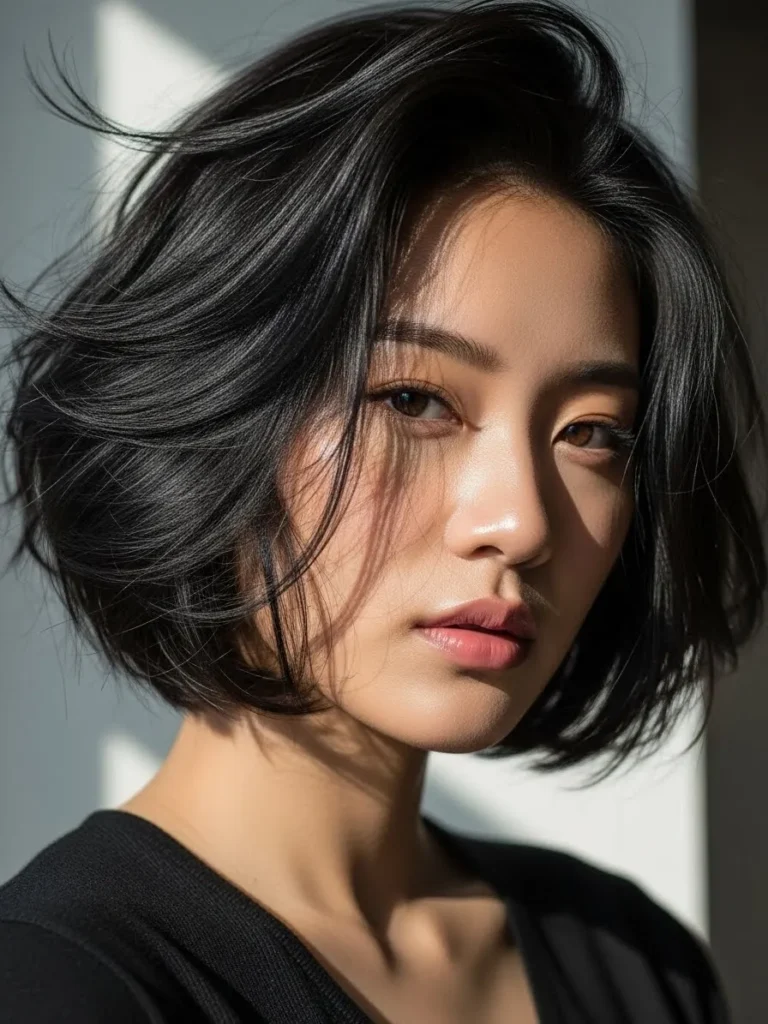 This textured bob hits around chin length with soft choppy layers that frame the face. The natural black color gives the style a sleek base that contrasts beautifully with the airy movement in the ends. The cut has a relaxed shape that still feels defined.