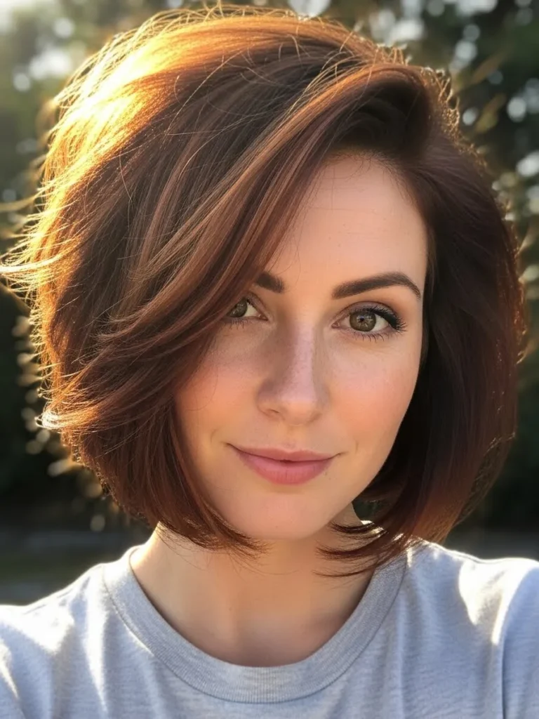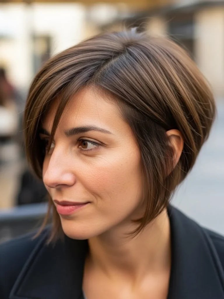 This polished bob sits neatly at the jawline with smooth layers that create a rounded shape without losing that crisp choppy edge. The chestnut brown color keeps the style warm and glossy while the soft side sweep gives the cut a gentle movement. Everything looks clean and intentional yet still easygoing.