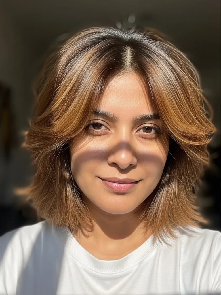 This honey toned bob has choppy layers that fall right above the shoulders with a pretty sun kissed finish. The lighter pieces brighten the face while the feathered ends add soft movement. The texture feels relaxed and lived in which makes the style look effortless.