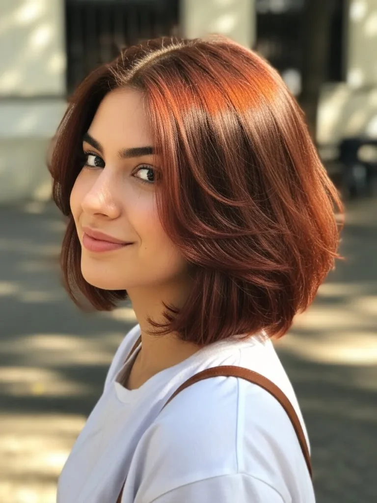 This medium bob has a rounded silhouette with feathered choppy layers that give it a soft bounce. The copper shade glows in the sun and creates depth throughout the cut. The texture is smooth near the top and fuller around the ends which keeps the whole look lively.
