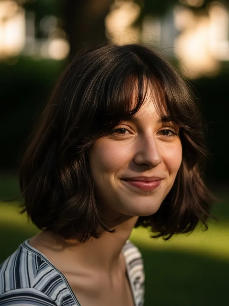This bob has airy feathered layers that add volume and softness all around. The wispy fringe blends naturally into the rest of the cut which makes the whole style feel playful. The medium brown shade adds dimension and keeps the texture looking light.
