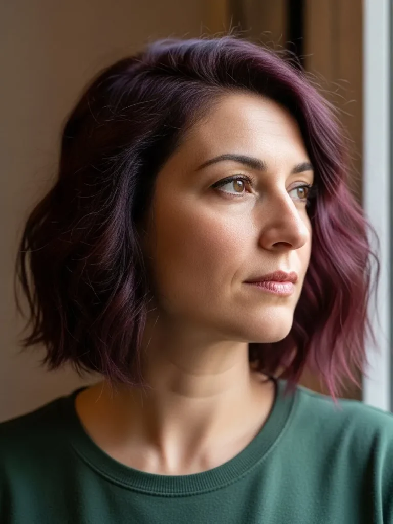 This bold choppy bob sits right at chin level with loose waves that give the style a full and textured shape. The deep plum color makes the layers stand out even more and adds a moody richness that feels modern and confident. The cut has an easy tousled finish that looks put together without trying too hard.
