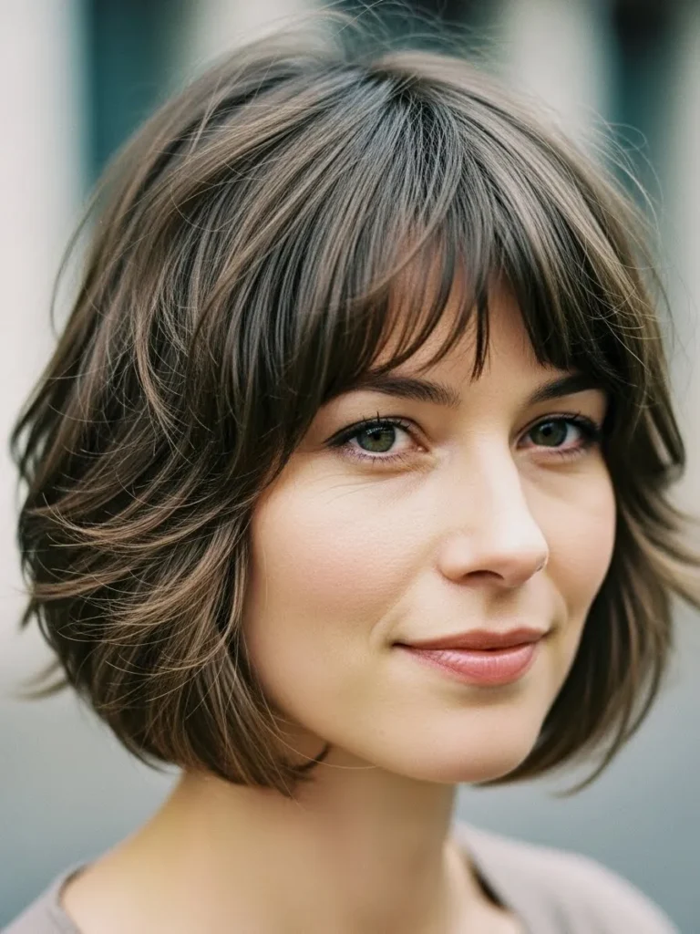 A round layered bob like this gives my thick hair so much personality. The shape feels bold but still soft and the smoky brunette shade adds a chic finish. It is one of those cuts that makes me feel stylish without even trying.