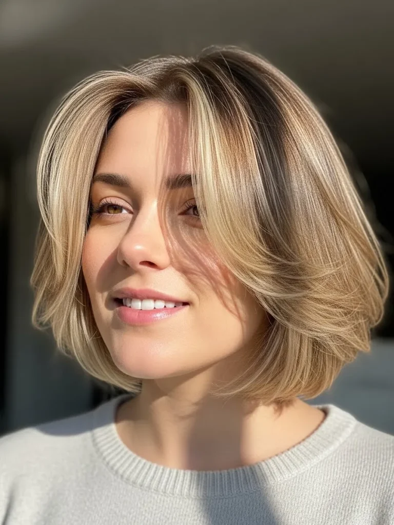 I find that face framing layers make thick hair feel so much lighter. They open up the face and give the whole style an easy charm. The beige color adds that cozy lived in look that makes the bob feel modern and relaxed.