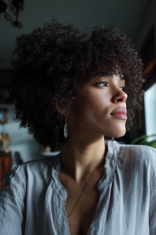 This soft rounded afro is full of airy volume with tightly coiled texture that creates a fluffy, cloud like shape. The curls are slightly loose at the ends with natural frizz that adds depth and a lived in feel.