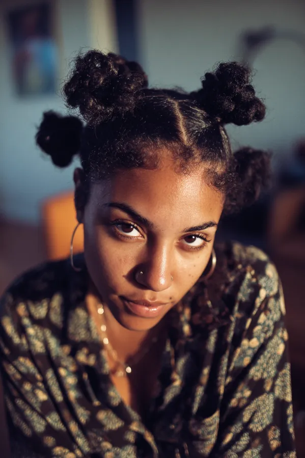 This playful style features two puff buns on each side with a clean center part and softly laid edges. The texture stays natural and fluffy, giving the buns a full and fun shape.