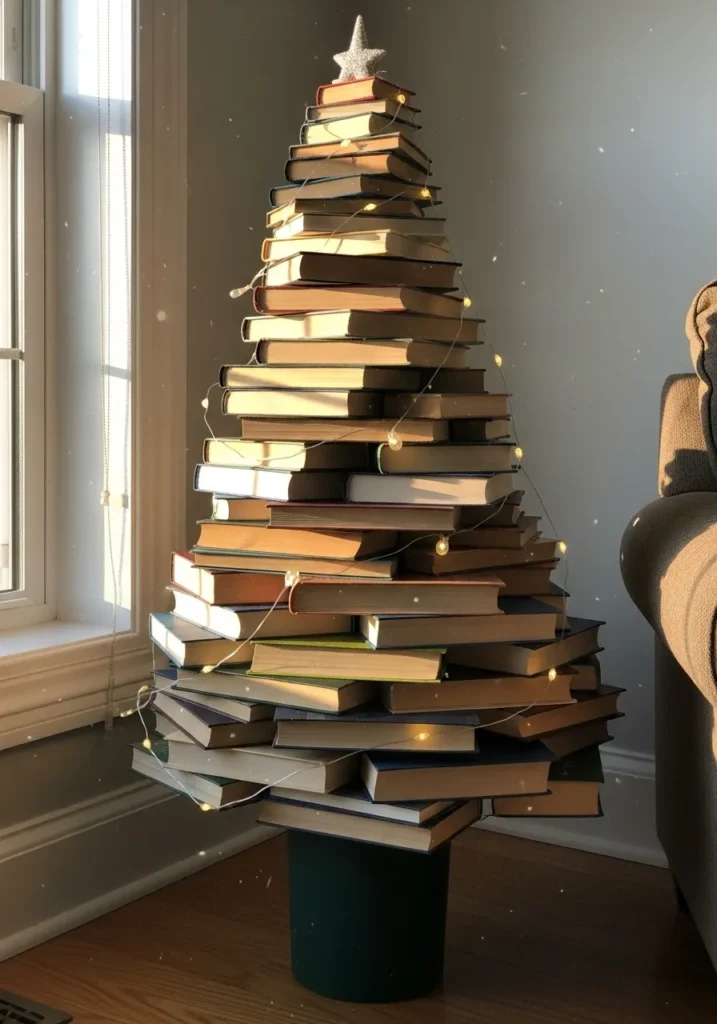 This clever little “tree” is built entirely from stacked books, perfectly layered in a cone shape and topped with a small sparkling star. A simple string of warm fairy lights wraps around the stack, giving it a soft, cozy glow that feels both creative and festive. The whole setup sits neatly by a window, letting natural light highlight the golden tones of the pages. It’s a genius idea for small spaces or anyone who wants to keep their Christmas décor low-cost but high on personality.