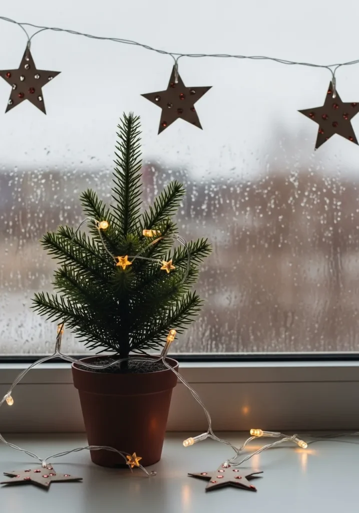 This cozy little setup proves that Christmas cheer doesn’t have to take up half your living room. A small potted evergreen sits neatly on a windowsill, twinkling with delicate star-shaped fairy lights that glow softly against a misty winter backdrop. Simple star garlands hang above the window, perfectly matching the minimalist yet heartwarming vibe. It’s that effortless kind of charm that feels like a warm hug on a cold December morning.
