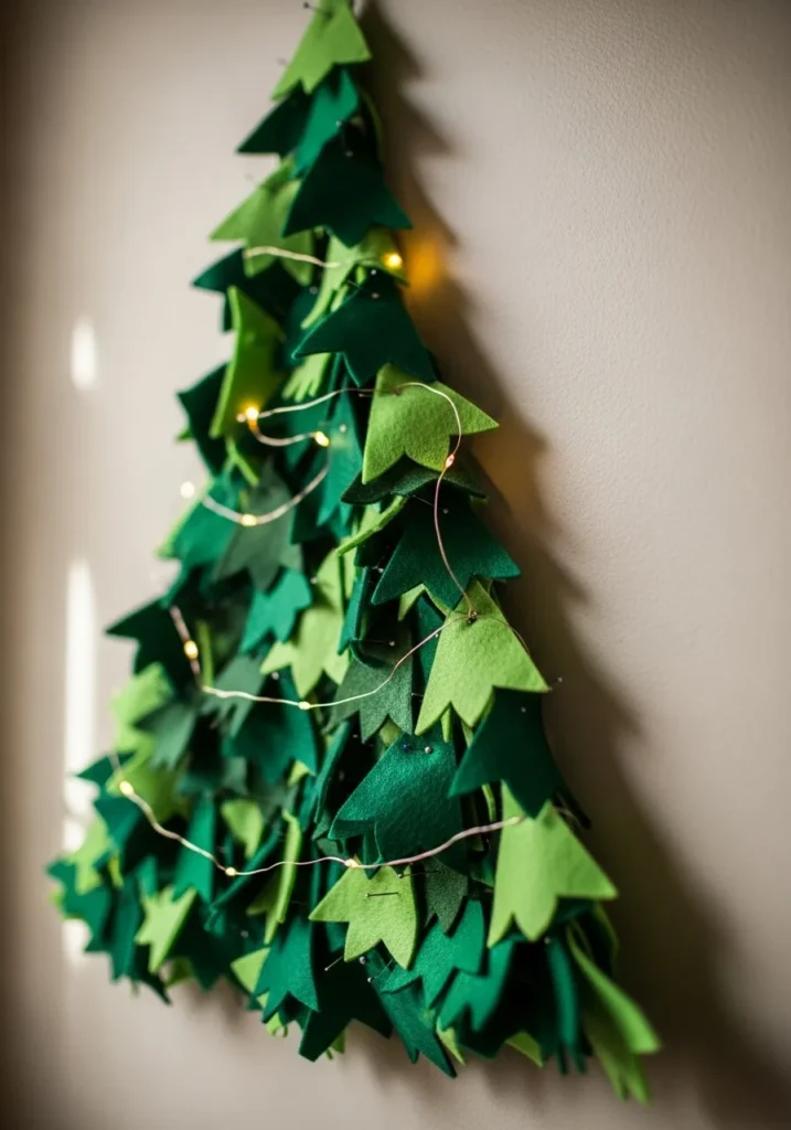 This clever wall-mounted Christmas tree is made entirely from layers of green felt cut into little tree-shaped pieces, arranged to create a soft, dimensional look. The varying shades of emerald and lime green give it a playful, textured feel, while a delicate string of fairy lights weaves through the fabric, adding a cozy twinkle. It’s a space-saving masterpiece that looks just as festive as a real tree, but without the mess of pine needles or the cost of store-bought decor.