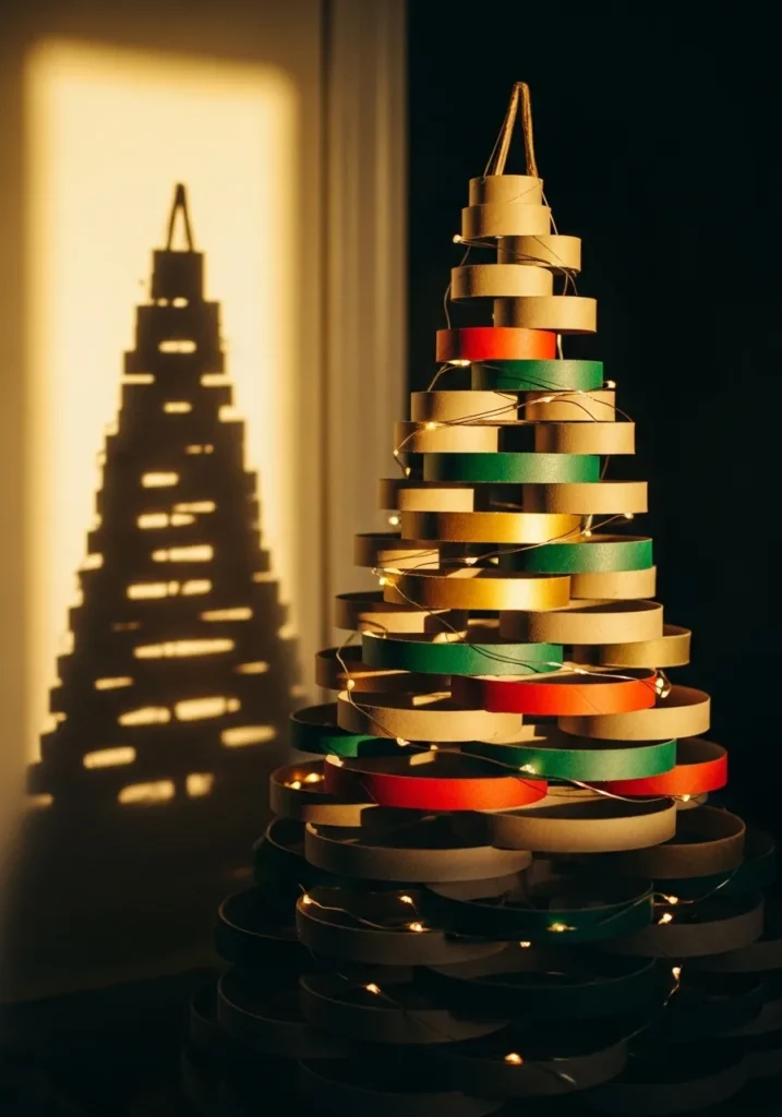 This clever Christmas tree design proves that you don’t need pine needles or pricey ornaments to make a big impression. Made entirely from stacked cardboard rings, each one painted in warm shades of gold, red, and green, it creates a modern geometric silhouette that feels both artistic and festive. A string of dainty fairy lights winds gently around the rings, giving off a cozy golden glow that reflects beautifully on the wall, forming the loveliest tree-shaped shadow. It’s eco-friendly, affordable, and perfect for minimalists who still love a touch of holiday sparkle.