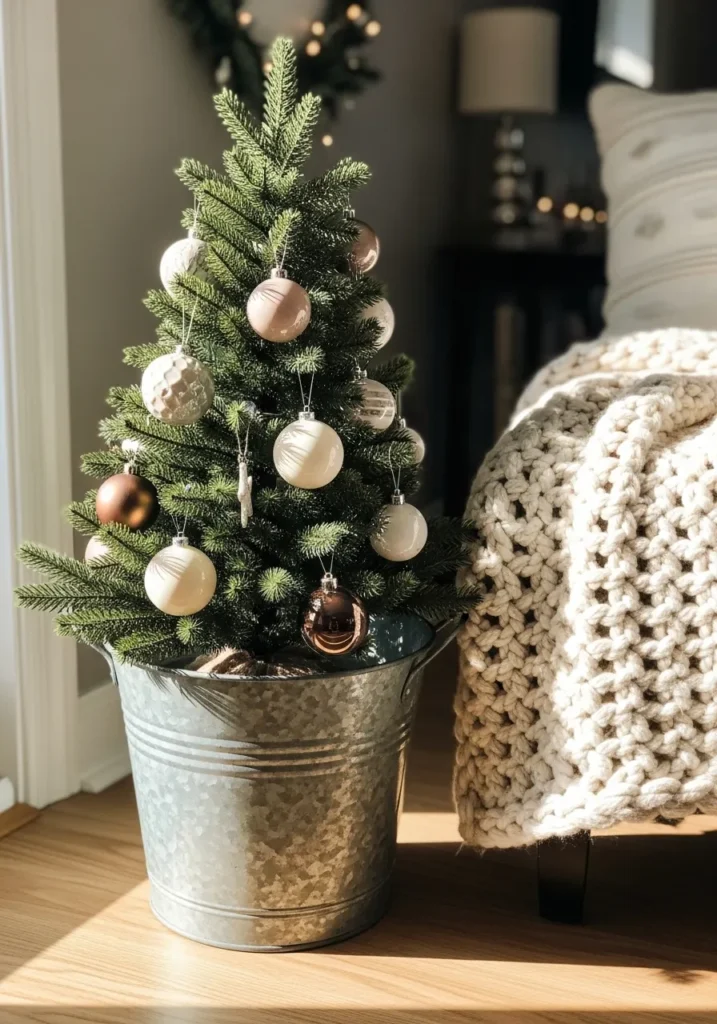 This cozy little Christmas setup proves that you don’t need a towering tree to make your home feel festive. A small evergreen sits neatly inside a galvanized metal bucket, its branches dotted with champagne, copper, and cream ornaments that shimmer softly in the light. The chunky knit throw draped nearby adds warmth and texture, creating a scene that feels both rustic and modern at once.