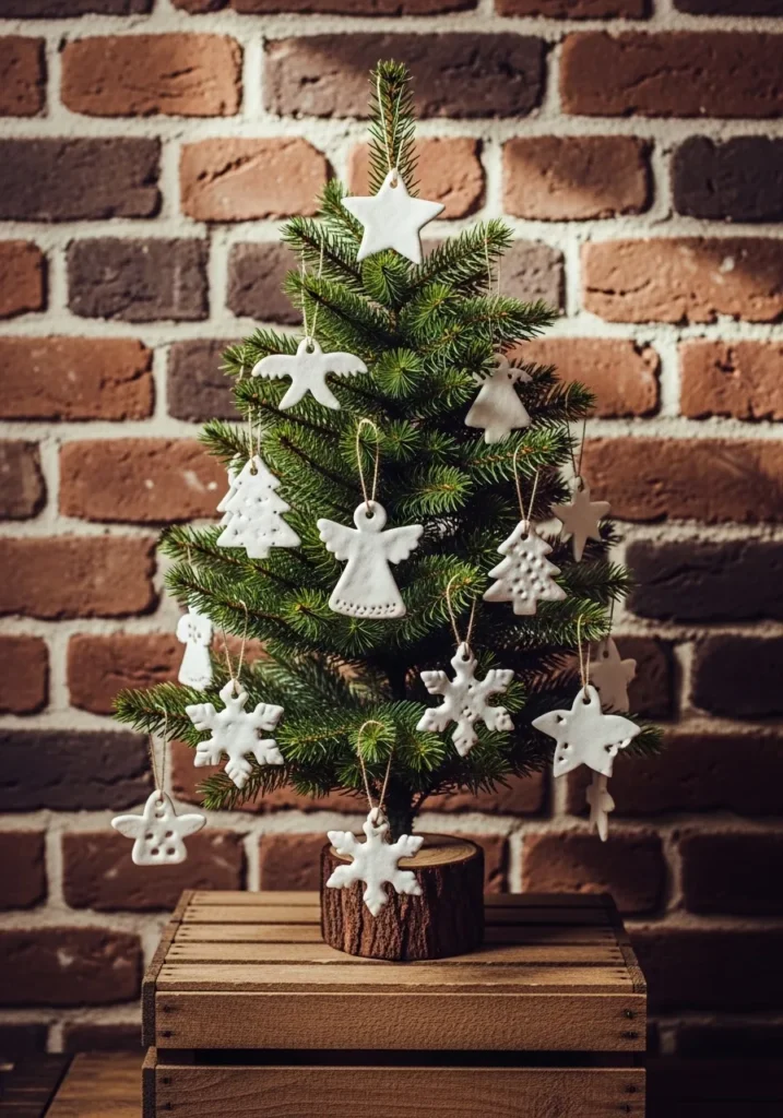 This little Christmas tree looks like something straight out of a cozy cabin holiday dream. It’s a petite evergreen perched on a wooden crate, dressed up with the sweetest white clay ornaments shaped like stars, snowflakes, angels, and trees. The natural brick wall behind it gives the setup a warm rustic charm that feels both homely and stylish. It’s proof that you don’t need glitter or grandeur to make a Christmas corner shine—just a few simple, handmade touches can make all the difference.