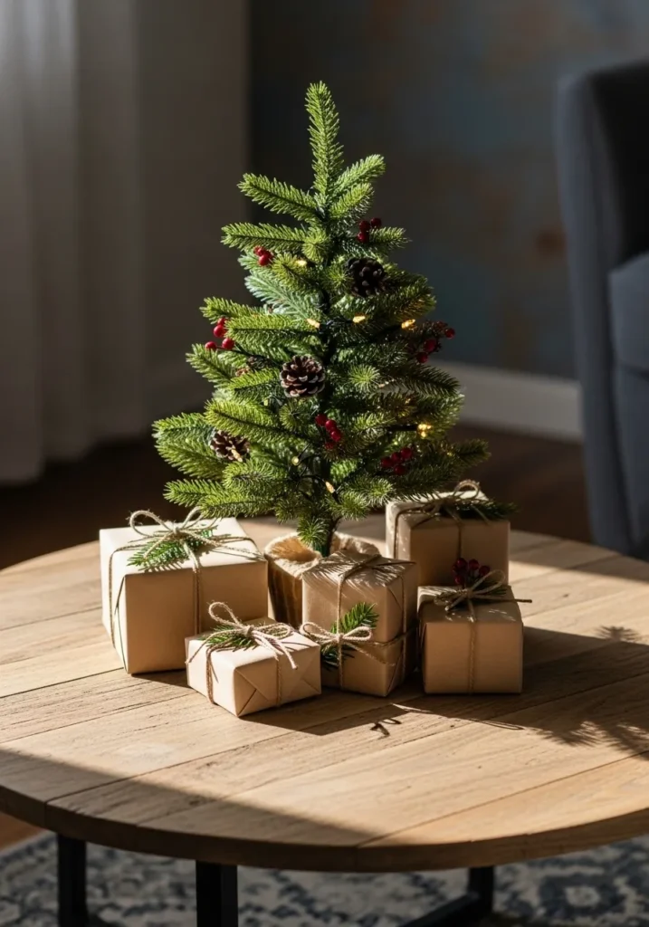 This little Christmas setup proves that magic doesn’t need to come in full size. A miniature pine tree sits proudly on a simple round wooden table, wrapped in warm fairy lights and dotted with pinecones and red berries. Around its base, a cluster of brown paper packages tied with twine completes the look—so cozy, so understated, and completely timeless. The natural textures of the wood, twine, and greenery create that perfect blend of rustic charm and holiday glow without spending a fortune.