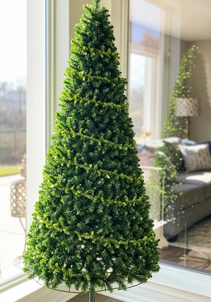 This design shows just how stunning simplicity can be. The tree stands tall and full, its fresh green branches perfectly shaped and naturally lush without a single ornament. Placed near a bright window, the daylight highlights every soft needle, giving it that freshly cut forest look. The clean, uncluttered setup lets the greenery do all the talking, blending beautifully with a cozy modern living space in the background.