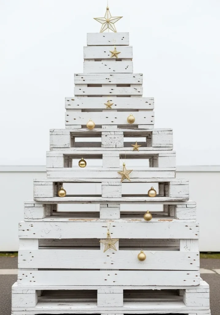This clever Christmas tree hack turns humble wooden pallets into a full-sized festive showpiece. Each layer of white-painted pallet wood is stacked in a perfect pyramid, creating a charming geometric shape that’s both rustic and modern. Simple gold ornaments and star toppers add a subtle touch of sparkle without overwhelming the minimalist vibe. The distressed texture of the wood gives it that cozy, farmhouse feel while keeping things clean and uncluttered.