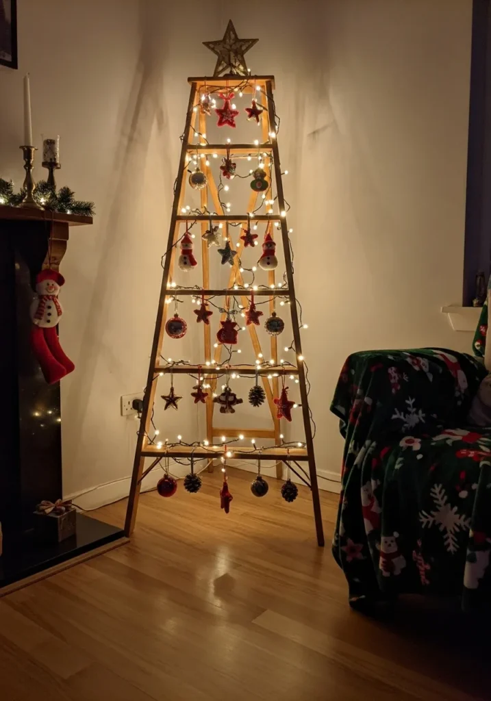 I absolutely love how creative and resourceful this idea is. It feels so personal, like something you’d make on a quiet December evening with a cup of cocoa nearby. There’s something about using everyday pieces, like a ladder, that makes holiday decorating feel fun and approachable. It proves you don’t need a fancy tree to make a room sparkle—just a little imagination and a strand of lights.