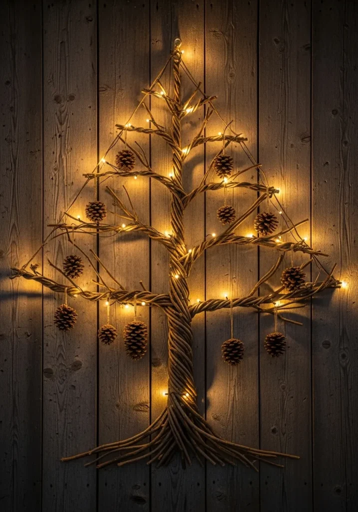 This clever little creation proves that Christmas magic doesn’t need to come in a box from the store. The “tree” is made entirely from twisted twigs and branches arranged on a wooden wall, forming a perfectly simple triangle shape. Warm fairy lights are wrapped delicately around the twigs, while a handful of pinecones dangle like charming natural ornaments. The soft golden glow against the rustic wooden backdrop gives this setup the coziest cabin-in-the-woods vibe.