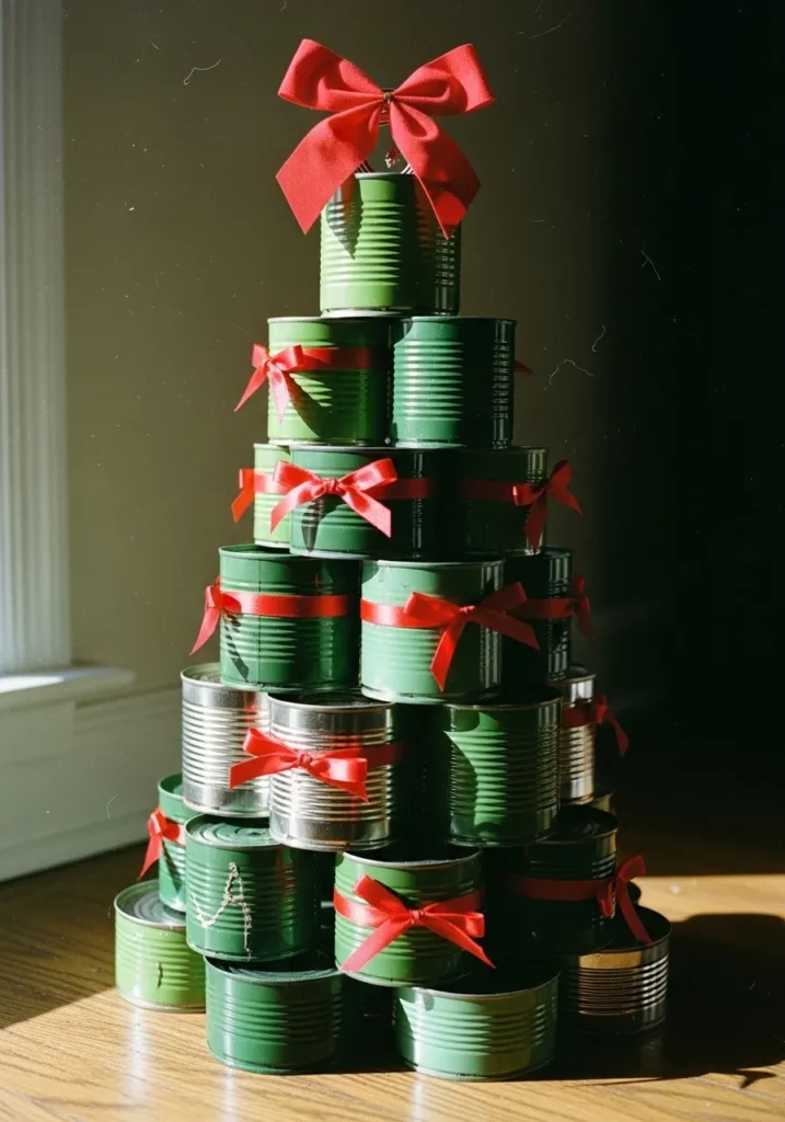 This creative little tree proves that you don’t need to spend a fortune to make something totally charming. It’s made entirely from stacked tin cans, each one painted in festive green tones and tied with bright red ribbons. Arranged in a pyramid shape and topped with a cheerful bow, it captures that cozy, handmade Christmas spirit while keeping things wonderfully simple. The sunlight glinting off the metallic edges gives it just the right touch of shimmer, perfect for a kitchen corner or cozy dining nook.