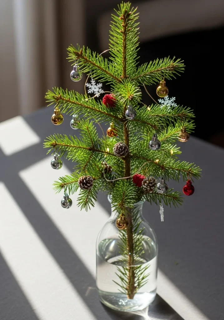 This charming little setup proves that you don’t need a full-sized tree to make Christmas feel magical. A single evergreen branch stands tall in a clear glass bottle filled with water, adorned with miniature baubles, pinecones, and tiny pops of red and gold. The sunlight catches the ornaments beautifully, making the whole piece sparkle in the simplest way possible. It’s the kind of design that feels intentional yet effortless, like a little whisper of holiday cheer sitting quietly on your coffee table or windowsill.