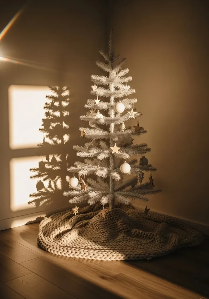 This cozy corner features a petite white Christmas tree that feels effortlessly elegant. The tree is adorned with simple wooden stars and matte white ornaments that catch the soft afternoon light just right. The chunky knitted tree skirt adds a lovely dose of warmth and texture, creating that perfect contrast against the sleek wooden floor. The shadows dancing on the wall make it feel calm and inviting, like the kind of moment you’d quietly savor with a cup of cocoa.