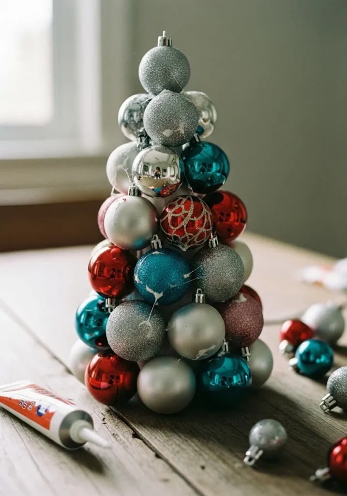 This adorable tabletop tree is made entirely from classic Christmas ornaments, stacked neatly into a cone shape that looks far more polished than its humble materials suggest. A mix of glossy red, glittery green, shimmering silver, and pearly white baubles gives it a cheerful, festive glow, while the small size makes it perfect for tiny apartments, office desks, or cozy corners. You can even spot the glue tube nearby, a charming reminder that this is a DIY project anyone can actually pull off in an afternoon.