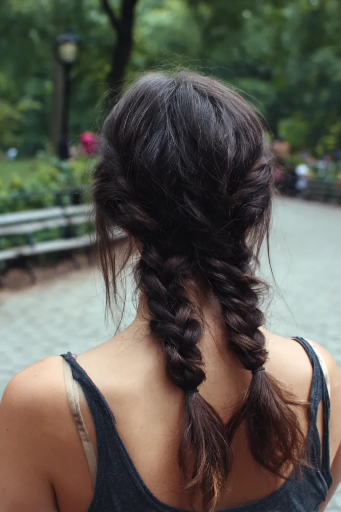 If you’re into a style that stays put while you’re out exploring the city, these double braids are an absolute win. The low placement feels much more grown-up than high pigtails and provides a chic silhouette from the back. It works so well because it highlights the natural thickness of your hair while keeping everything manageable and tangle-free throughout the day. This is such a reliable choice for a busy weekend or a casual park stroll when you want to look cute without any fuss.