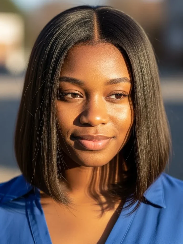 I absolutely love how this style frames the face, creating a sharp yet soft look that’s perfect for both professional and casual settings. It’s flattering because it gives the illusion of fullness without feeling heavy, and the shine adds a touch of glam to your look.