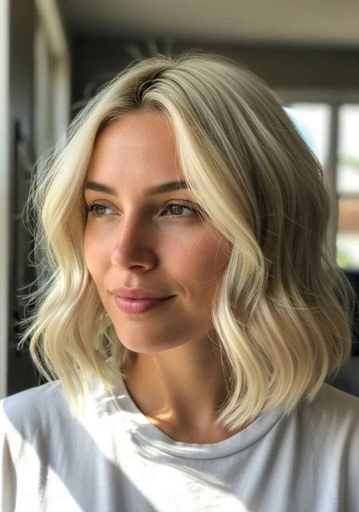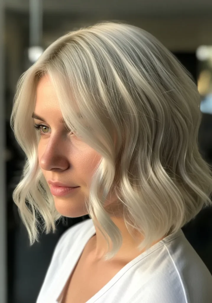 This hairstyle is ideal for anyone who loves a natural, youthful look with just the right amount of texture. The platinum blonde is so flattering and fresh, and the waves give it that beachy, carefree feel. It’s a low-maintenance look that always feels polished.